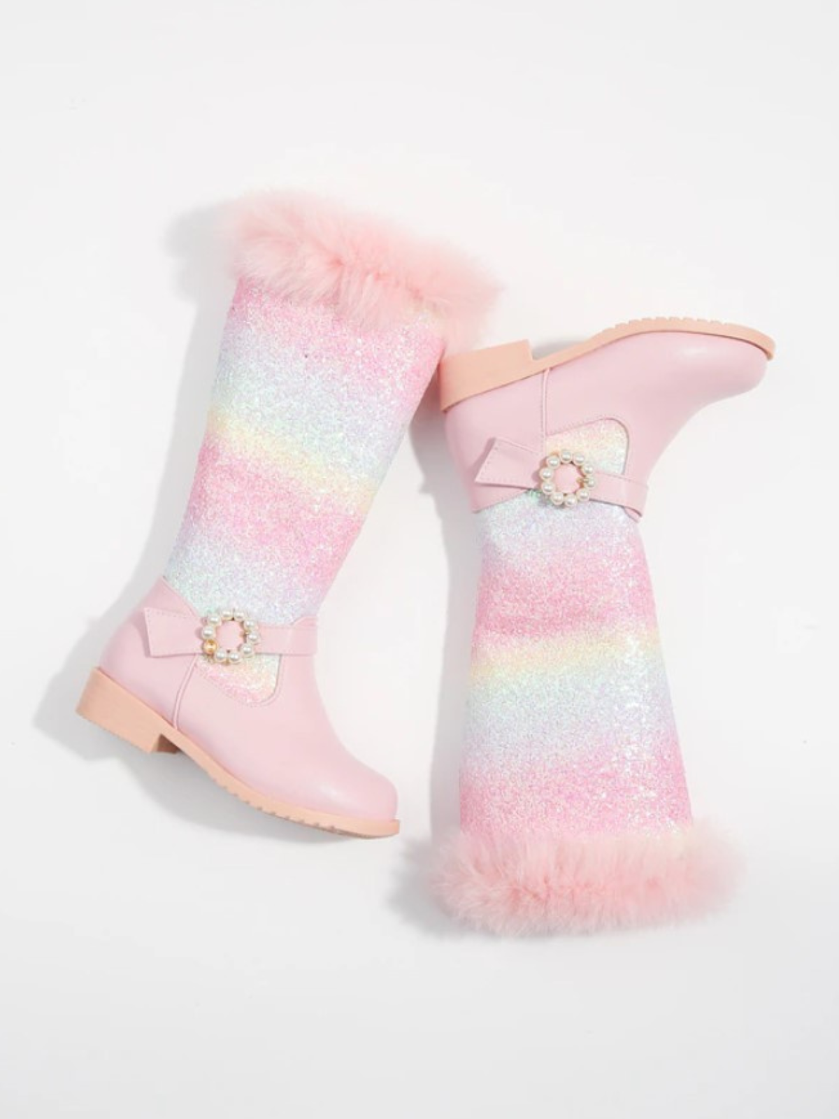What's at the end of the rainbow? These glitter rainbow boots! Decorated with sparkly sequins, fur trim, and a cute buckle detail, this magical pair is sure to make your little girl look and feel so enchanted. The dreamiest pair of shoes for princesses!
