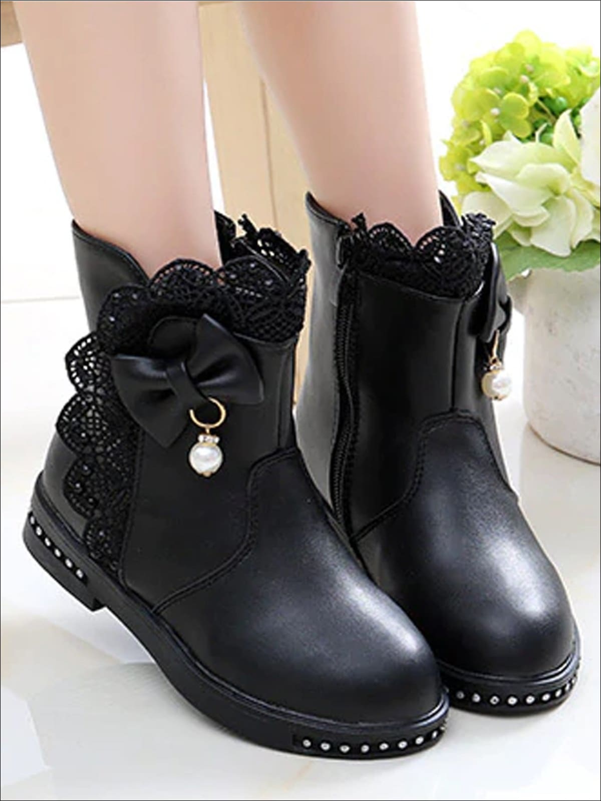 Girls Lace Trimmed Crystal Embellished Bow Tie Ankle Boots