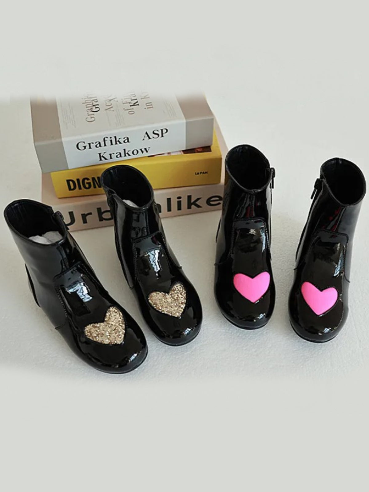 Keep your little girl's toes warm and her heart happy with our heart toe patent boots. Made for sweethearts, this lovely pair is sweet and just a little sassy with a shiny patent finish and a cute heart accent on the vamp. Guaranteed to spread love wherever she goes!