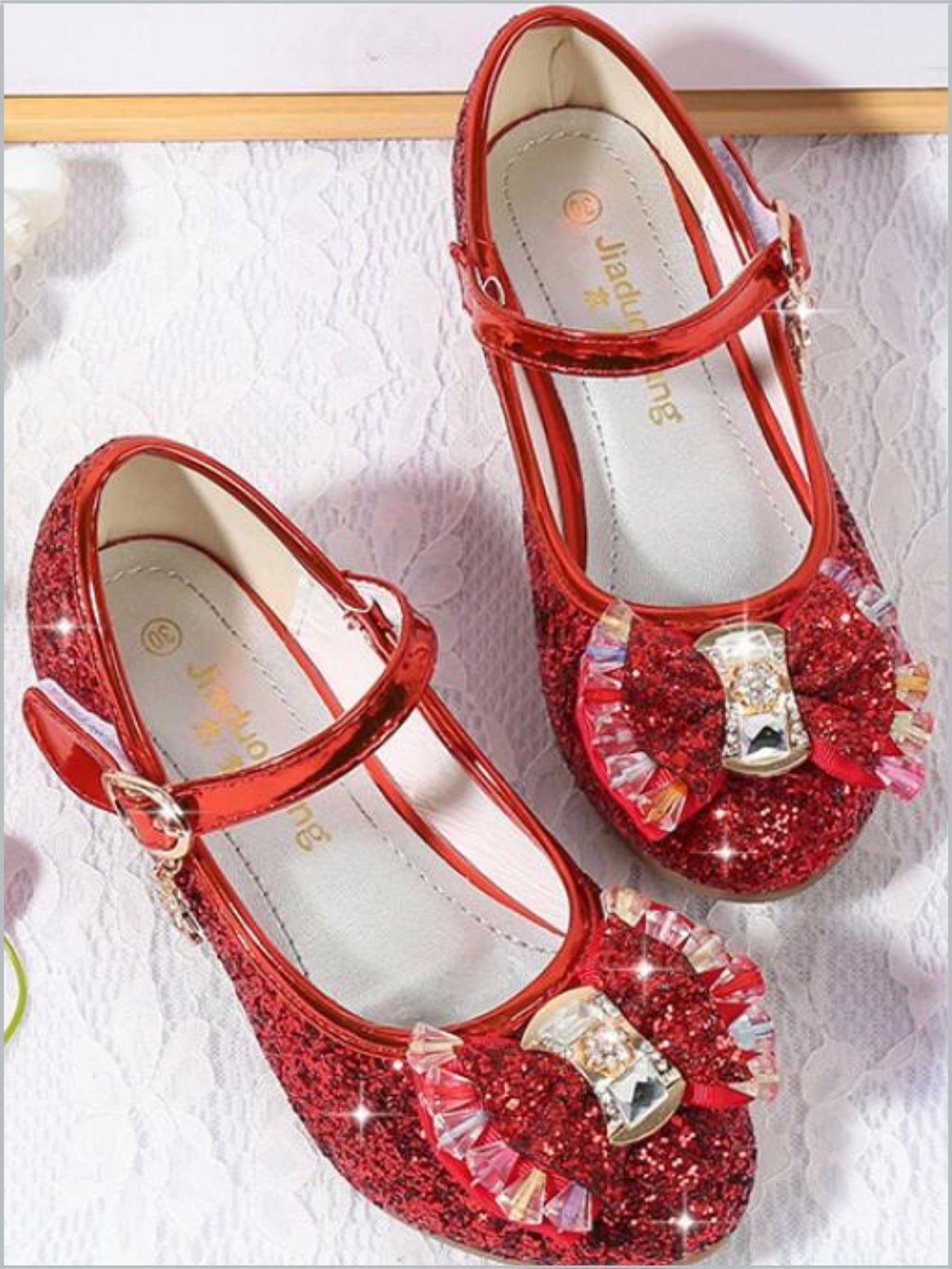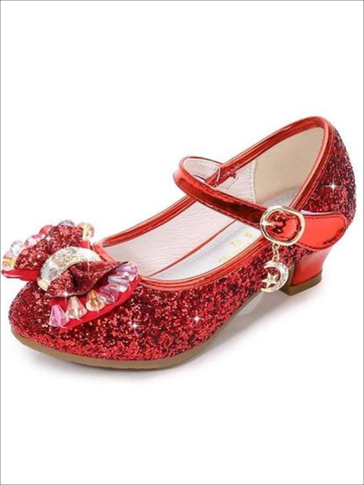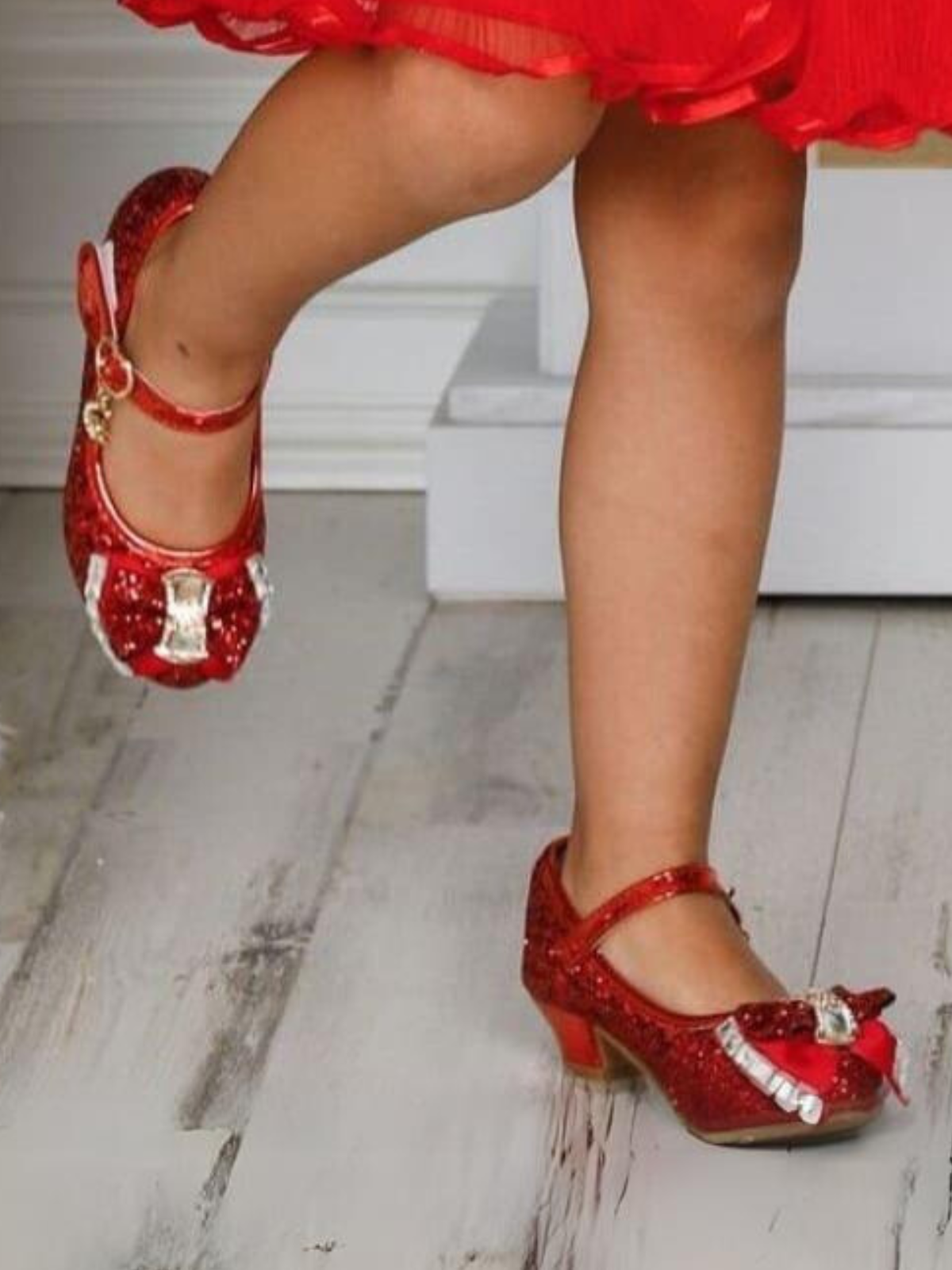 • Click your heels together and think of fashionably fun princess shoes for girls. You're not dreaming! It's our sparkle red glitter princess shoes with a dazzling gem bow! Make each step more magical than the last with the slightly elevated heel!