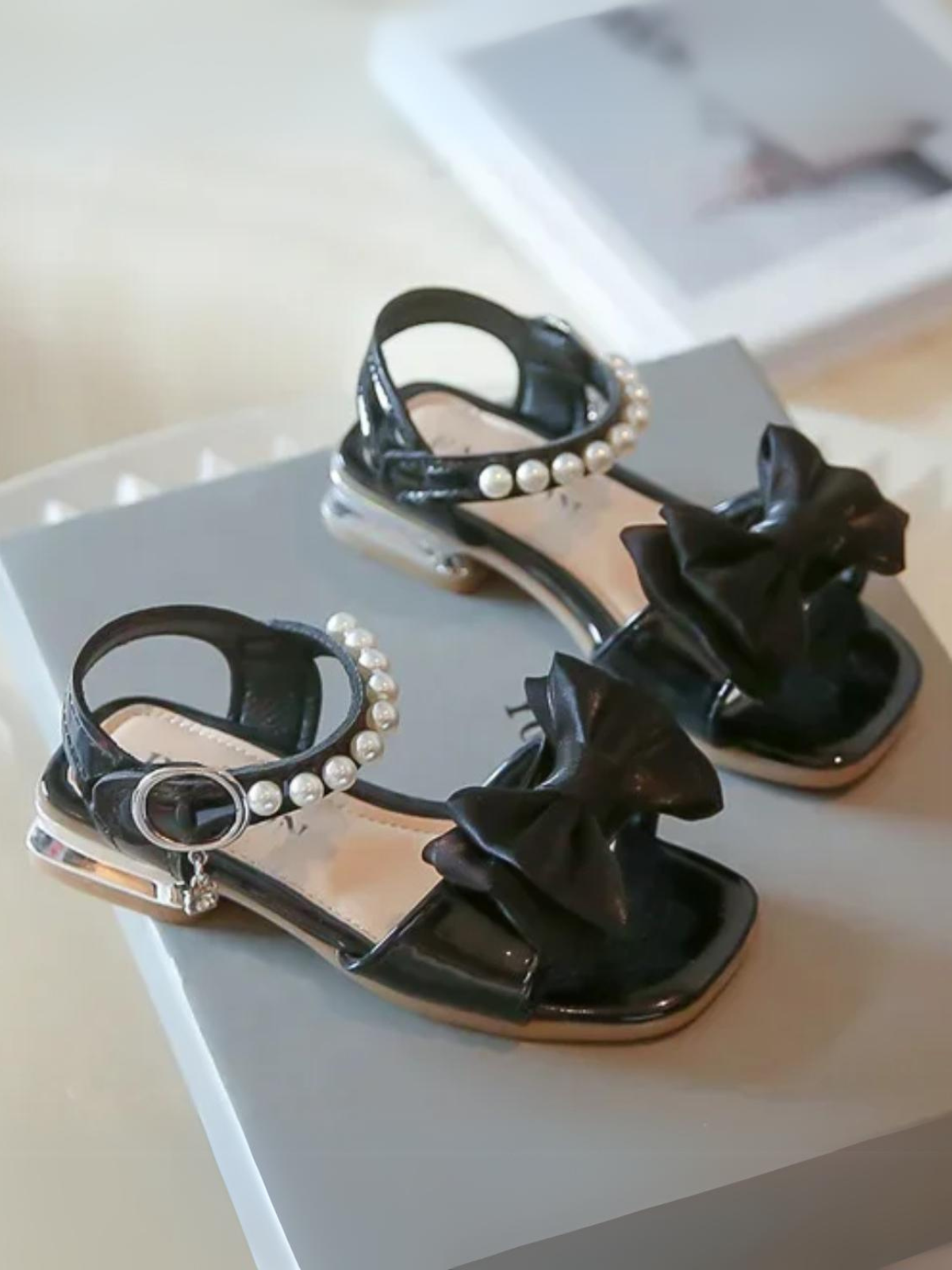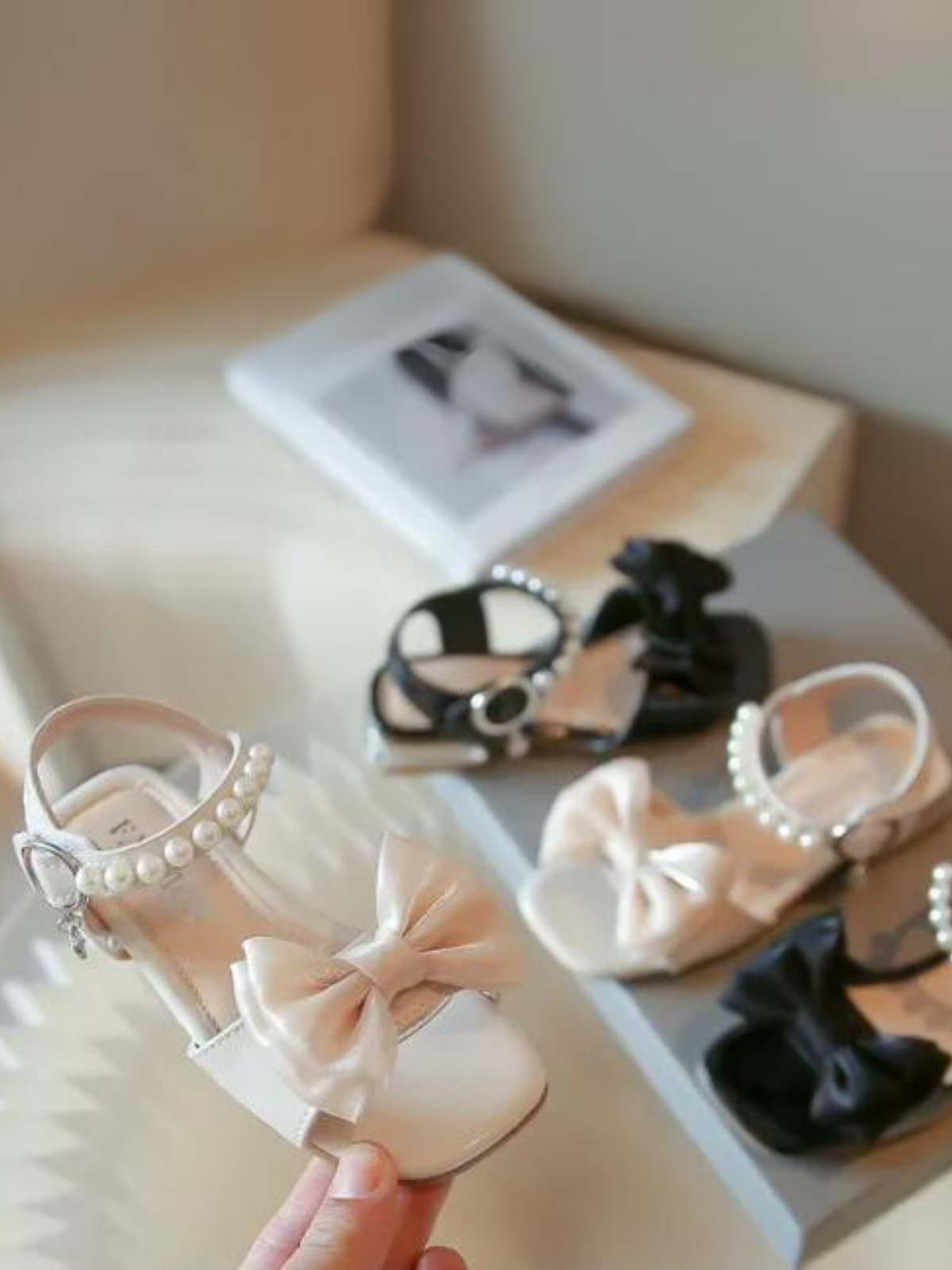 Step into elegance with these delightful girls' sandals adorned with charming bows and delicate pearl details.
