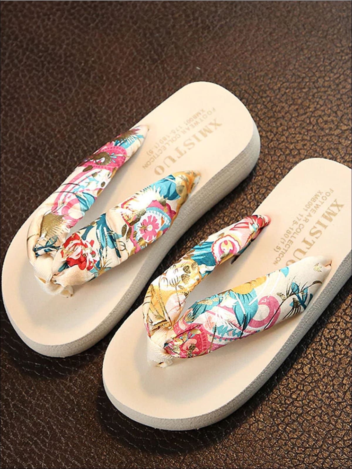 Puffy thong strap sandals with tropical print