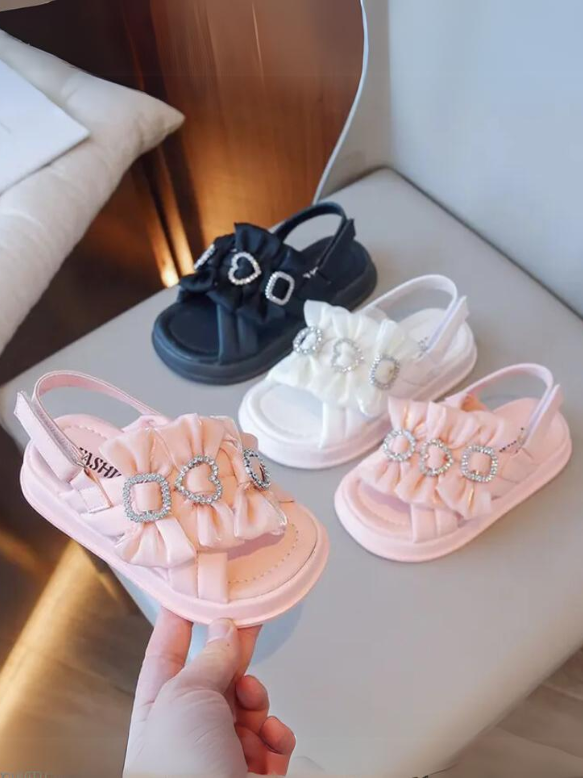 • This season wouldn't be complete without our stylish rhinestone bow sandals. They easily pair with both classy and casual looks for the ultimate summer ensembles.  Three sweet bows, three dazzling rhinestone buckles and three colorways means one happy little girl!