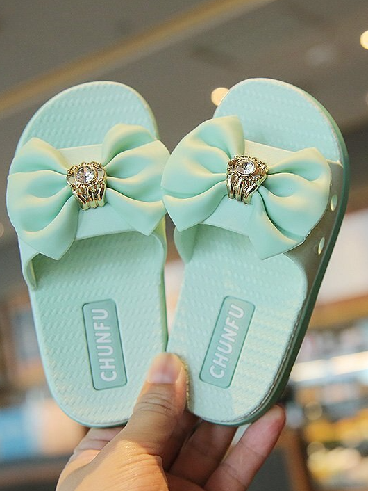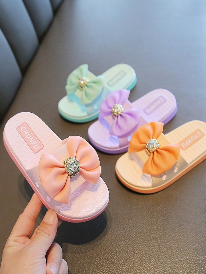 - Slides feature pleated bow foot band with jeweled center