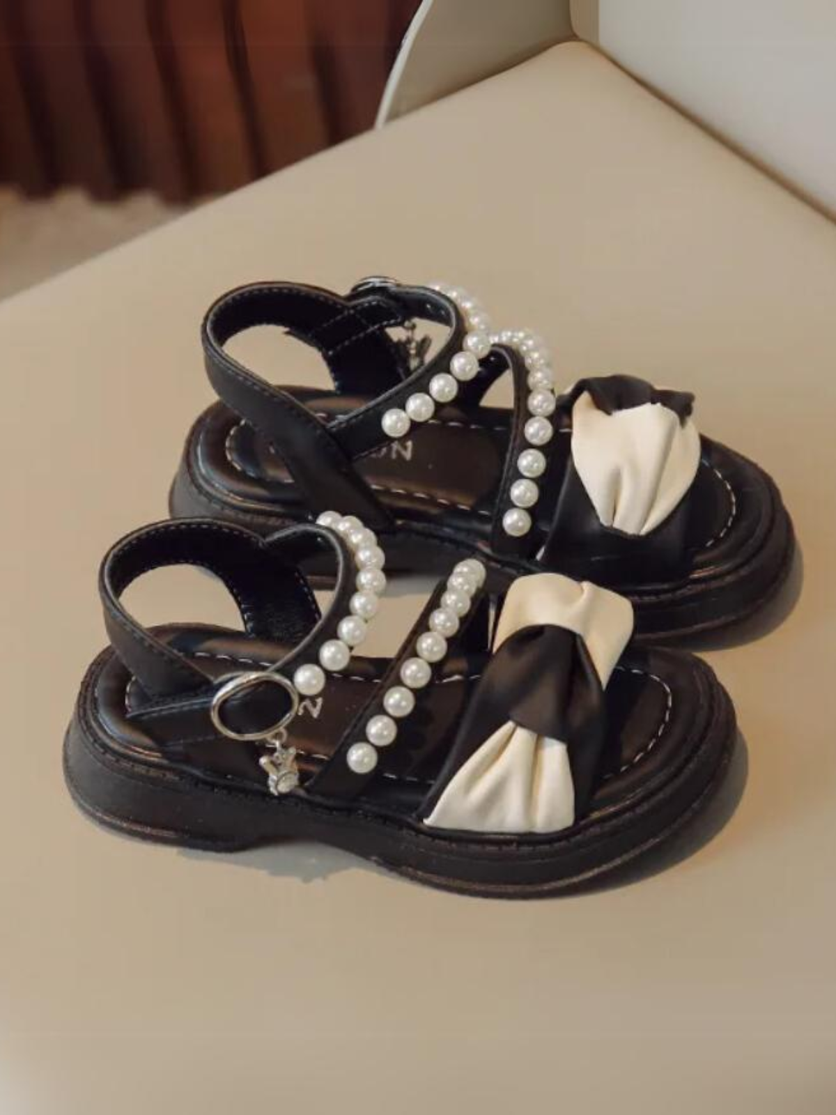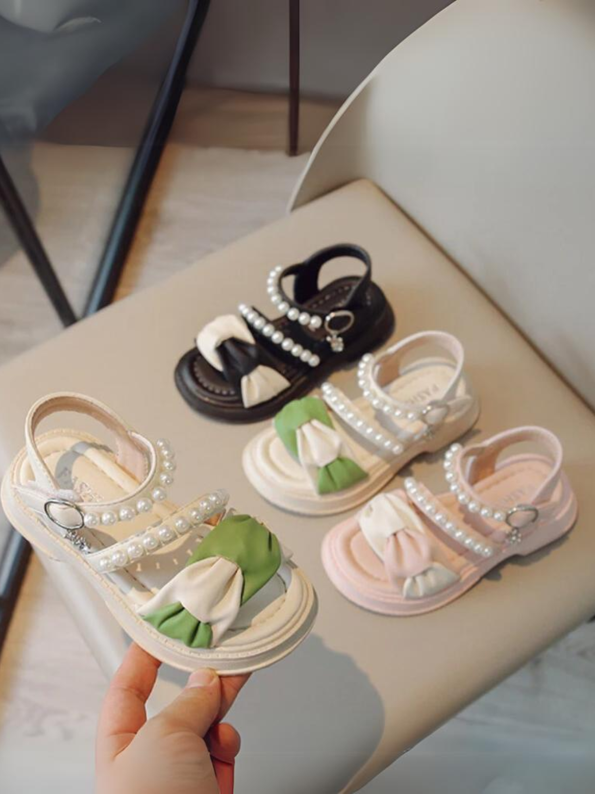 • Introducing our Elegant Pearl Trimmed Bow Sandals —a must-have for any young fashionista.