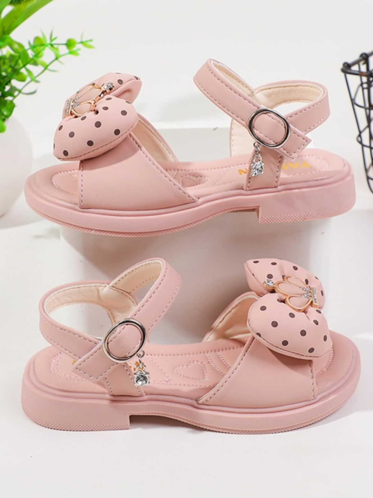 • Adorned with an eye-catching polka dot bow accented with a sparkling heart, these sandals are sure to capture hearts.