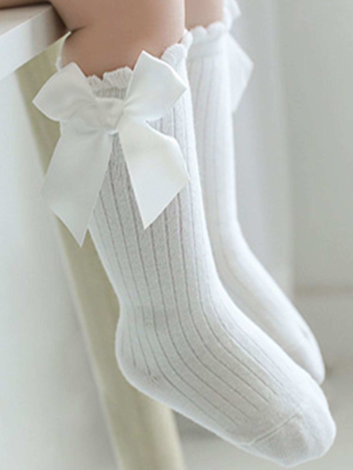 Scallop trim ribbed cotton socks with lateral satin bow accent